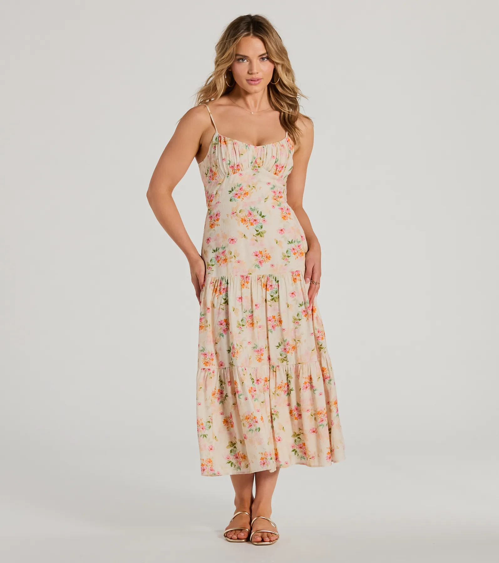 Soiree Hour Lace-Up Ruffled Floral Midi Dress